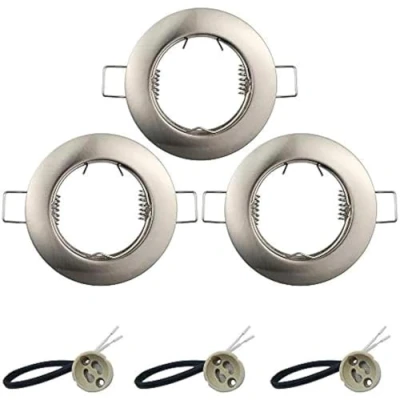 Materil: aluminum, The ceiling opening size: 60-65 mm.LED ceiling light frame outer size: 78 *78 mm, inner diameter: 51mm. This ceiling downlight impresses with its simple shape, the radially polished, silver, gives you that nice and clean finish look. 3 Pieces recessed spotlight trim ring fitting with GU10 ceramic lamp holders, round ring not tiltable. meet to replace the old light fixture frame. Use for mount diameter 50mm LED/MR16/GU10/GU5.3 led spotlight bulbs/halogen bulb. Gu10 recessed mounting ring splash-proof mounting also suitable for the use in wooden ceiling, plaster ceiling or furniture, also fit mount in wet rooms, but it's not suitable for the bathroom.