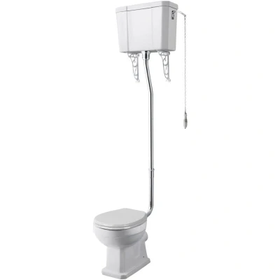ManoManoGeneral description The Balterley Kinston Traditional Comfort Height Toilet Pan with High Level Cistern, Flush Pipe Kit & Soft Close Seat in White combines Victorian-inspired elegance with modern practicality. Featuring a raised cistern, polished chrome flush pipe, and ornate brackets, it creates a striking heritage look. The comfort height pan enhances accessibility, while the soft-close seat ensures ease of use. Technical specifications Dimensions: W: 80 mm D: 515 mm H: 1683 mm Material: Durable vitreous china Finish: Glossy white Installation Partial assembly required Fixings not included Usage Comfort height design improves accessibility for sitting and standing Soft close seat prevents slamming, enhancing comfort and safety Other information Complete set includes cistern, polished flush pipe kit, ornate brackets, pull chain handle, and soft close seat 5-year guarantee for quality assurance