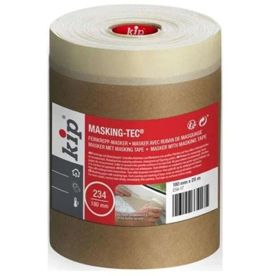 General description Kip® 234 Paper Masker Tape is made from high-quality premium crepe with environmentally friendly, unbleached super absorbent soda masking paper. This versatile tape is designed to save time by masking and protecting surfaces in one go, making it ideal for use on door frames, skirting boards, and windowsills. It is particularly effective when used with emulsion and spray painting. Technical specifications Width: 180mm Length: 25m Temperature resistance: up to 80 °C Carrier material: premium fine crepe with unbleached soda masking paper (50 g/m²) Tear resistance: 40.2 Adhesive: Natural Rubber Adhesion to Stainless: 4.52 Elongation: 9% Indoor service duration: up to 7 days Usage Can be applied up to 7 days before use For best results, remove immediately after painting Suitable for almost all indoor surfaces