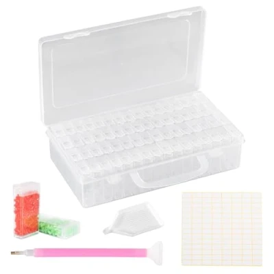 Quality material: diamond organizer is made of high quality PP material, sturdy and durable, not easy to fall and break Large capacity: a total of 64 small boxes, each box has a size of 5.1 x 2.6 x 1.3 cm, enough to meet your daily requirements Convenient to Carry The outer box of the diamond organizer has a carrying handle that makes it easier for you to carry it. EASY TO HANDLE Each small box is made of transparent material with 112 small labels, so you can quickly find the diamonds you need. Multi-purpose: can store a variety of painting diamonds, nail decorations, flower seeds, and other small items