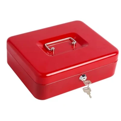 Material: scratch-resistant epoxy powder coated steel Removable coin tray Convenient carry handle Cylinder lock supplied with 2 keys Dimensions: 300 x 240 x 90 mm.