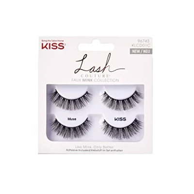 KISS Lash Couture Faux Mink Collection Double Pack of False Lashes, Muse, Ultrafine, Tapered, Synthetic Fake Lashes includes Glue