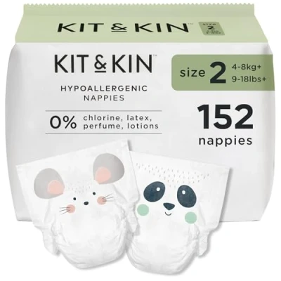 Kit & Kin Premium Eco Baby Nappies Size 2 4 8 kgs / 9 18 lbs Pack of 152 Plant Based Hypoallergenic Superior Leak Protection Vegan Cruelty Free