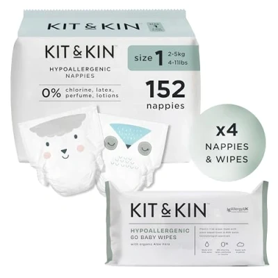 Kit & Kin Premium Eco Friendly and Sustainable Starter Pack Bundle Baby Nappies Wipes Hypoallergenic with Flash Dry High Performance Layer Size 1 160 Nappies, 240