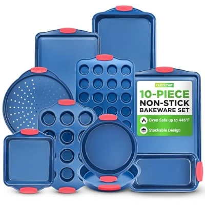 10 PIECE BAKEWARE SET: Includes baking trays, cookie sheets, loaf pan, pizza pan, square pan, two round cake pans and muffin trays. This baking tray set provides versatile oven trays and baking tins for cakes, muffins, roasting and everyday home baking. NON STICK BAKING TRAYS: Premium carbon steel bakeware set with durable non stick coating for easy food release. Bake cookies, cakes, muffins and roasting dishes without sticking while ensuring even heat distribution for reliable baking results. SAFE OVEN BAKEWARE: Made from BPA free carbon steel and designed to be PFOA, PFOS and PTFE free. This baking tray set delivers safe baking performance while the red silicone handles provide a secure grip when removing trays from the oven. VERSATILE BAKING TINS: Includes round, square and rectangular pans so you can bake cakes, brownies, bread, muffins and roasting dishes. Ideal for beginners, home bakers and anyone looking for a complete baking set for everyday cooking. BUILT FOR EVERYDAY BAKING: Heavy duty carbon steel construction with 0.4 mm tray thickness provides strength and durability. These non stick oven trays are stain resistant, easy to clean and dishwasher safe for convenient kitchen use., Weight: 9.15 Pounds, Manufacturer: Sound Around