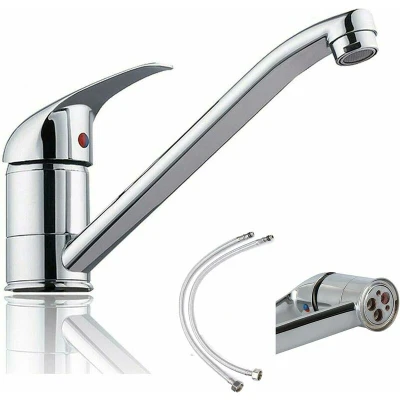 General description Modern single lever chrome kitchen sink mono basin mixer tap with a swivel spout, designed for both hot and cold water. This faucet combines functionality with a sleek design, making it a perfect addition to any kitchen. Technical specifications Material: Brass Finish: Chrome Features: Hot and cold water indicator, swivel spout Includes: Diffuser for smooth water flow, threaded pipe fitting kits Installation Easy and fast installation with included fitting kit and flexible connection hoses Use waterproof tape or silicone to prevent water leaks Usage Ideal for converting twin sinks Other information Package includes: 1 x tap, 1 x fitting hose, 1 x installation manual