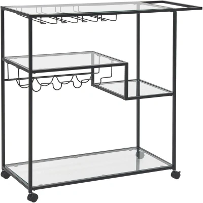 Industrial Kitchen Cart with Bottle Rack. A minimalistic proposition with a multitude of applications, this kitchen trolley is designed with functionality in mind. Fitted with bottle and glass racks, it can serve as a full-fledged bar cart, just as well as it can be used to serve food. Ample storage space is provided by four open surfaces, while rolling castors with safety brakes ensure, that no matter the load, moving the cart around is effortless. Details: Product Type: Kitchen Trolley General Color: Black, Transparent Material Type: Metal Main Material: Iron Additional Material: Tempered Glass Frame Material: Metal Legs material: Synthetic Material Top Material: Glass Finish: Powder Coated Leg Caps/ Pads: No Shelves: Yes Dimensions: Depth: 40 cm Width: 103 cm Height: 94 cm Weight: 16 kg Shelf Weight Capacity: 5 kg Top Weight Capacity: 20 kg Offer Includes: 1 x Kitchen Trolley Key Features: Swivel Castors with Locking Brake, Special Wine Glass Racks, Features Built in Wine Rack,