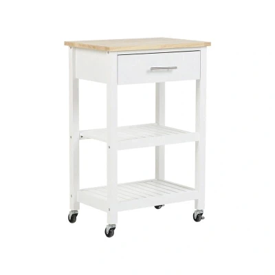 General description This Kitchen Trolley HIUMA in a farmhouse design excellently combines form with functionality. Whether you require additional counter space or extra storage, this trolley is the perfect solution. The wooden top offers a fresh look, while the MDF construction gives it a Scandinavian appeal thanks to its classic design. Four caster wheels allow for easy movement, making it ideal for even small kitchens. Show off your cooking pots, fresh groceries, or tableware on two open shelves, and store useful tools in the drawer. Technical specifications Product Type: Kitchen Trolley Style: Traditional General Color: White, Brown Main Material: Rubberwood Additional Material: Pine Wood Frame Material: Engineered Wood Top Material: Wood Number of Drawers: 1 Dimensions: Depth: 40 cm, Width: 58 cm, Height: 86 cm Weight: 13 kg Drawer Weight Capacity: 5 kg Shelf Weight Capacity: 15 kg Top Weight Capacity: 15 kg Installation Full assembly required Estimated assembly time: 45-60