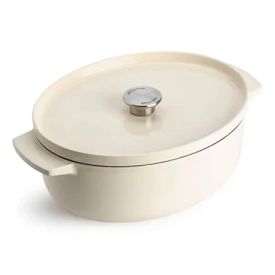 KitchenAid Cast Iron Almond Cream Non Stick 30cm Oval Casserole Dish with Lid