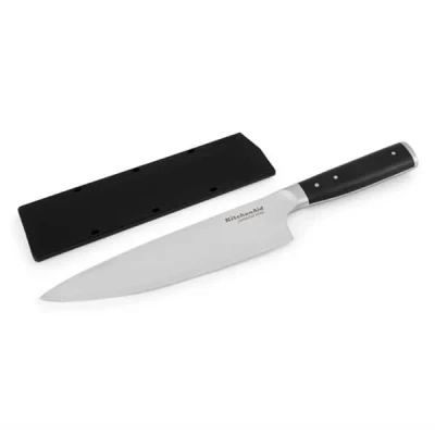 A real work horse in the kitchen, the KitchenAid Gourmet All-Purpose Kitchen Knife is forged from semi-polished, high-carbon Japanese steel which has been tempered and hardened for a long-lasting edge.For optimal control, this KitchenAid all-purpose kitchen knife has an eastern-style handle that has been expertly engineered with a textured finish for comfort and optimal control. The triple-riveted ergonomic handle is accented with a stainless steel end cap.Blade length: 20cm.This KitchenAid Gourmet all-purpose kitchen knife is supplied with a custom-fit blade cover to protect the blade during storage.Top rack dishwasher safe, although hand washing is recommended for long-lasting performance.This KitchenAid Gourmet High-Carbon Japanese Steel All-Purpose Kitchen Knife is supplied with a 1 year manufacturer's warranty.  Knives are not for sale to persons under the age of 18. - all knives and bladed products are delivered by Age Verified Delivery (AVD). The carrier may request proof of age in order to deliver your parcel. If proof of age is not available, or the recipient is underage, the carrier will refuse to deliver.