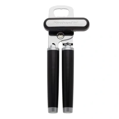 The KitchenAid Can Opener is made from strong stainless steel that will easily puncture and open all types of cans An oversized, easy to grip turn knob allows for opening cans with ease Integrated bottle opener: An integrated bottle opener is built into the head of the can opener. This can opener is durable and comes with ergonomic handles to provide a sure grip International products have separate terms, are sold from abroad and may differ from local products, including fit, age ratings, and language of product, labeling or instructions.