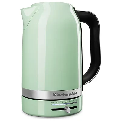 Harts of SturThis KitchenAid Breakfast Suite Pistachio Kettle features a full metal construction with a brushed stainless steel interior.The kettle has an easy to push button hinged lid and a viewing water window so you can easily see when the water needs topping up.Inside the kettle is a removable limescale filter, easy to replace and clean. The spout of the Pistachio kettle allows a quick and controlled pour, eliminating drips and spills when making your hot drinks.The variable temperature control on the kettle quickly and quietly heats the water to the desired temperature for a wide variety of hot drinks.The Pistachio Kettle has a 1.7 Litre capacity and also has a cord wrap feature for keeping your kitchen tidy.