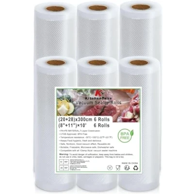 KitchenBoss 6Packs Vacuum Sealer Rolls: 20+28cm x 300cm 6 Rolls Food Storage Saver Bags BPA Free Vac Seal Roll, Machine Bag for Sous Vide Cooking, 18M Total
