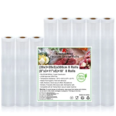 Extend the shelf life of food with KitchenBoss vacuum sealer bags:Our patented flower mesh grid design provides twice the airflow area compared to dot bags, ensuring superior sealing performance, extending the preservation effect of your food eight times. Keep your food fresh, flavorful, and nutrient-rich with KitchenBoss vacuum bags. Customize the size of your bag: the vacuum sealer wrap offers unmatched versatility and customization options, allowing you to create perfectly sized bags for any type of food. Say goodbye to crowded refrigerators and reduce food waste with our organized storage solution, ideal for meat, fish, fruit, vegetables, cheese and much more. Various sizes for your storage needs:Our vacuum wrap roll set contains 8 rolls of different sizes to meet all your food storage needs. The KitchenBoss vacuum bag food includes 3 rolls measuring 20 x 300 cm and 5 rolls measuring 28 x 300 cm, and is therefore compatible with a variety of vacuum sealing machines. International products have separate terms, are sold from abroad and may differ from local products, including fit, age ratings, and language of product, labeling or instructions., Weight: 2.645547144 pounds, Manufacturer: KitchenBoss