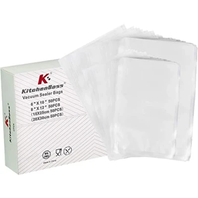 Thickened and tear-resistant: Made of 7 layers of co-extrusion film material of Kitchenboss vacuum bags, each vacuum bag ensures durability and tear resistance. The relief surface of the mesh is 254 μm, and the smooth plate is 102 μm. It is very suitable for preserving all types of food without worrying about punctures. Professional Food Vacuum Bag: The airflow channel area of the patented mesh relief bag is twice the size of that of the dot bag, and the negative pressure is as high as -65 kpa.The storage time is 8 times longer than ordinary vacuum bags. It is an ideal protection against freezer burn and loss of taste. Safety and health: 100% BPA free. Using environmentally friendly materials brings us one step closer to a more sustainable future. By using high quality materials, our vacuum sealing film exceeds your quality expectations with a whiter color, better toughness and lower oxygen permeability. Compatibility: The KitchenBoss vacuum bag is compatible with most brands of food vacuum machines and combines perfectly with your vacuum machines. Each bag has an easy-to-open opening that makes it easy to remove food without using scissors. You can relax at home after a hard day. Enjoy freshness: According to tests with an Oxygen Transmittance Device, KitchenBoo's professional shrink film has lower oxygen permeability than ordinary vacuum bags. Even with long-term storage, you do not have to worry that the oxygen content in the bag will increase. Improve the freshness and natural taste of food and make meat tender and juicy., Manufacturer: KitchenBoss