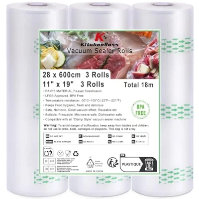 CUSTOM SIZE WITHOUT LOSS OF SPACE KitchenBoss vacuum bag set includes 3 rolls of 11x236 inches each. You can cut the bags to the perfect size so no space is wasted. @@@OCoijPchUV9hnNS1llKmHrO43VNTYqci@@@ Design These vacuum sealer bags are compatible with most vacuum sealers. They are easy to use and easy to handle. The embossed dot design on one side of the bag reinforces the vacuum effect and additionally improves the sealing and freshness. THICK & PUNCTURE RESISTANT The vacuum sealer bags are made of 7-layer coextruded film with high toughness and sufficient thickness to effectively withstand punctures by sharp ingredients (such as bones, herringbones and hard-shelled seafood). FOOD GRADE MATERIAL This vacuum sealer rolls meets food safety standards. Whether for storing raw foods (such as fresh meat and seafood) or portioning cooked foods (such as stews and leftovers), it ensures the safety of the ingredients and is free from impurities. Widely used: vacuum food bags are not only suitable for preserving fresh ingredients such as vegetables, seafood and meat, but can also be used for moisture-protected storage of cereals, dry goods, pills and other items. The vacuum seal extends the freshness of the food and maximises the preservation of nutrients., Weight: 2.094391489 Pounds, Manufacturer: Shenzhen Green Electrical Appliance Co., Ltd