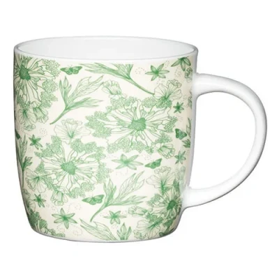 This KitchenCraft china mug has a 425ml capacity and features a green botanical leaf design to brighten up your morning tea or fresh coffee. The barrel shape design features a generous sized handle that is comfortable to hold and provides a firm grip. The mug is suitable for use in the microwave and is dishwasher safe for easy and convenient cleaning. The colorful design of this KitchenCraft mug is perfect for giving as a gift or for home as part of a matching collection.