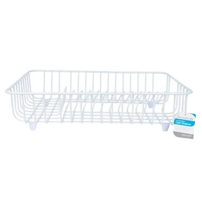 Keep your kitchen surfaces dry and your dishes safely elevated with the KitchenCraft Coated Dish Drainer - a smart, practical solution for efficient air drying after washing up. Designed for everyday use, this dish rack combines durability and cleanliness in a sleek, space-conscious form.Beneath its minimalist white finish lies a robust iron core, delivering the strength and stability needed for daily family washing up. The plastic coating helps prevent rust, while also protecting delicate dishes and your draining board from chips, scratches and other damage.Ideal for compact kitchens or busy households, this drainer holds up to eight plates, along with mugs, bowls and cutlery. Its neutral aesthetic suits both classic and contemporary interiors.Dimensions: 44.5cm (L) x 35cm (W) x 10cm (H). Weight: 0.71kg.Supplied with a 12-month manufacturer's guarantee for added assurance.