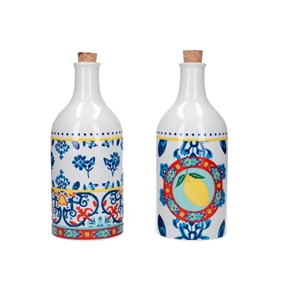 Complete your Greek salad, margherita pizza or slice of Spanish tortilla bread with a drizzle of olive oil or balsamic vinegar from this World of Flavours Ceramic Oil and Vinegar Set. This set of two ceramic oil and vinegar bottles with cork stoppers is ideal for storing and serving all types of oils and vinegars for salads, bread and antipasti. The cork stoppers fit tightly in the spouts too. This creates a tight seal, which keeps those fruity notes and flavours locked in so you can enjoy them for longer! With stylish designs, they are perfect for use in the kitchen or tabletop. Each bottle has a 500ml capacity. Suitable for hand washing.