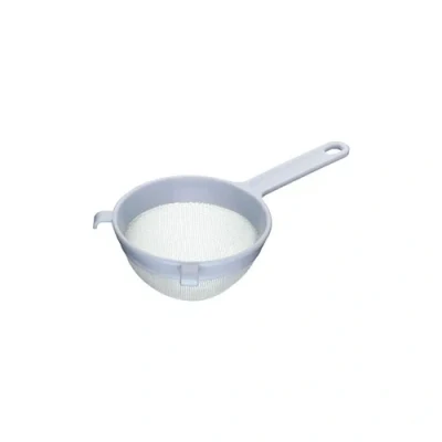General description Lightweight round sieve designed for various kitchen tasks, featuring a heat-resistant fine mesh center and a durable heat-resistant plastic frame. The sieve is equipped with a comfortable handle and twin resting arms for easy use. Technical specifications Diameter: 12 cm Material: Nylon mesh and plastic