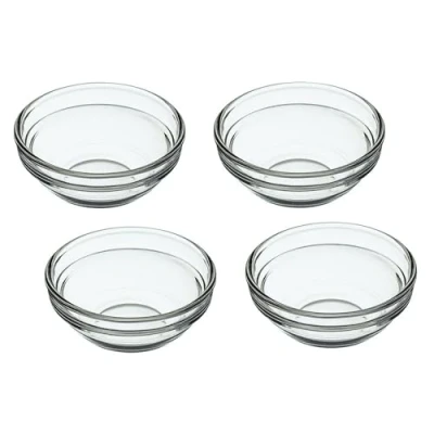Display delicious homemade dips, serve sauces and prep for tricky recipes with this set of small glass pinch bowls Designed to withstand daily use, you won’t need to replace these strong, thick-rimmed bowls in a hurry Simply stack the bowls away when you’ve finished to save space in kitchen cupboards You get 4 bowls in the set. They each measure 7.5 cm (3") wide, and hold up to 55 ml (2 fl oz) Twelve month guarantee. Dishwasher safe. Microwave safe