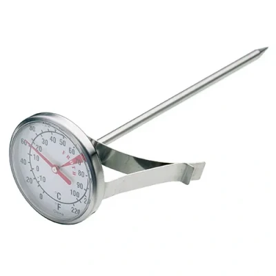 Harts of SturStainless steel thermometer designed for measuring the temperature of milk and frothed milk for use when making and serving drinks. The easy to read Celsius and Fahrenheit dial has the ideal frothing temperature outlined, and clips easily to the side of a jug or saucepan to monitor the temperature as the milk is being warmed / frothed. For perfect froth for cappuccinos, liquid should reach a temperature of between 65 - 70°C (149 - 158°F).