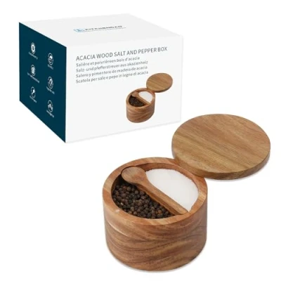 KITCHENDAO Acacia Wood Salt and Pepper Bowl Box,Built in Spoon,Two Compartments Spice Seasoning Container,Sea Cellar Holder,Built Spoon,Magnetic Swivel Lid,Dual 5oz Capacity