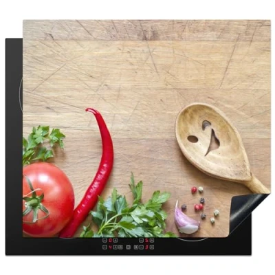 KitchenYeah© Induction Hob Cover Protector Mat 20.1"x23.2" / 59x51 cm Kitchen Universal Ceramic Covers for Electric Cookers Vinyl Vegetable Wood Texture Ladle Smiley Tomato
