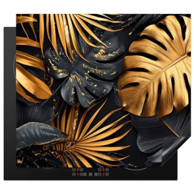 KitchenYeah© Induction Hob Cover Protector Mat 20.5"x23.2" / 59x52 cm Kitchen Universal Ceramic Covers for Electric Cookers Vinyl Leaves Gold Black Nature
