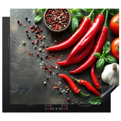 KitchenYeah© Induction Hob Cover Protector Mat 20.5"x23.6" / 60x52 cm Kitchen Universal Ceramic Covers for Electric Cookers Vinyl Vegetable Pepper Red Grey Concrete