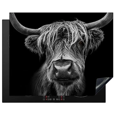 KitchenYeah© Induction Hob Protector Mat 20.5"x25.6" / 65x52 cm Stove Cap Top Cover Kitchen Cooker Covers for Electric Hobs Vinyl Scottish Highlander Horns Black White Cow