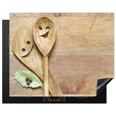KitchenYeah© Induction Hob Protector Mat 20.5"x25.6" / 65x52 cm Stove Cap Top Cover Kitchen Cooker Covers for Electric Hobs Vinyl Wood Spoons Brown Smiley