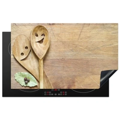 KitchenYeah© Induction Hob Protector Mat 20.5"x33.5" / 85x52 cm Stove Cap Top Cover Kitchen Cooker Covers for Electric Hobs Vinyl Wood Spoons Brown Smiley