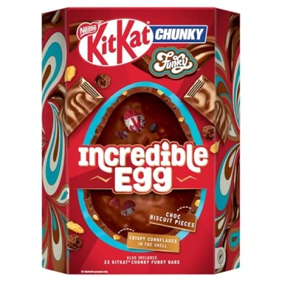 380g KitKat Chunky Funky Incredible Easter Egg A giant creamy milk chocolate egg with crispy cornflakes and chocolate biscuit inclusions Includes 2x KitKat Chunky Funky Chocolate bars Perfect for sharing or gifting this Easter Have a break, have a KitKat Rainforest Alliance Certified cocoa