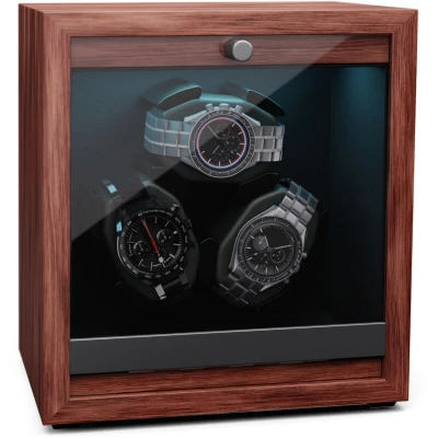 PROTECT AND DISPLAY YOUR WATCHES: Watch winders are an exquisite way to display your automatic watches while ensuring they are fully wound and in peak condition the next time you put them on. LEDS FOR A STYLISH VIEW: Watches are meant to be seen and admired! The Klarstein automatic watch winder for 3 watches has blue LEDs, four turntables and an acrylic door to stylishly showcase the craftsmanship of your watches. ADJUSTABLE NUMBER OF ROTATIONS: Not every automatic watch requires the same number of rotations. Our automatic watch winder has 4 settings: 650, 900, 1200 and 1500 revolutions per day, for a longer service life. THE DESIGN IS IN THE DETAILS: Like every watch, this quiet watch winder box features advanced craftsmanship, including impact-resistant plastic and a mechanism that holds any watch securely without adjusting the strap. EXTRA-QUIET OPERATION: Whether in your bedroom or in the watch winder box, this automatic wooden watch winder is powered by an ultra-quiet motor that