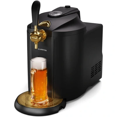 PERFECT ACCOMPANIMENT: Beer dispenser with CO2 pressurised cartridge system for fresh beer enjoyment from the keg at home, ideal for every party and event, always the perfect beer to hand. CHILLED AT LIGHTNING SPEED: This compression beer cooler with UltraFast Cooling technology chills beer kegs from room temperature to 2 to 12 °C in just 4 hours, perfect for any beer dispenser or home bar setup. INDIVIDUALLY ADJUSTABLE: Set cooling temperatures from 2 to 12 °C for the perfect beer every time. This beer dispenser ensures that your draft beer is always at the optimum temperature for any type. ALWAYS INFORMED: The clever fill level indicator keeps you updated on remaining beer levels in the beer dispenser, ensuring that it's always topped up in good time for your home pub or bar. ELEGANT DESIGN: Stylish black plastic and brushed stainless steel in gold make this beer dispenser a real eye-catcher on counters, sideboards, and in beer tents. Perfect for home bars. For extra cool and extra
