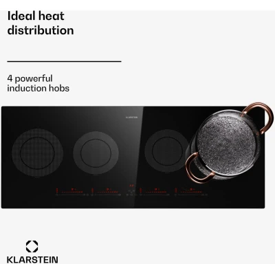 General description The Klarstein Ceramic Hob Cooktops offer a modern and efficient cooking experience with five induction zones and a total power output of 11600W. The innovative slider touch controls allow for easy temperature adjustments, while the new slow and steady heat mode ensures gentle simmering for delicate dishes. With a sleek design and premium ceramic glass surface, this electric cooker hob not only enhances your cooking but also adds elegance to your kitchen. Technical specifications Total dimensions: approx. 35 x 90 x 6 cm (WxHxD) Minimum surrounding worktop width: 5 cm Minimum thickness of the worktop: 3 cm Minimum distance to kitchen slopes above: 76 cm Minimum clearance under the unit: 5 cm Air circulation space: 2 cm min. Cable length: approx. 100 cm Weight: approx. 9 kg Power output: up to 11600W Power per zone: 7200W Compatibility and accessories Compatible with various cookware materials (not suitable for aluminium, copper, glass, or heat-resistant glass). Usage