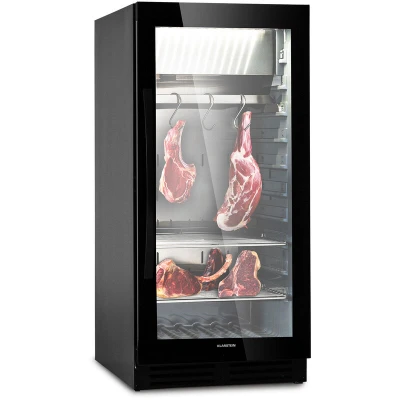 General description Dry ageing is one of the oldest and most proven methods of refining meat. By storing meat at low temperatures, the rich flavors in each cut become more concentrated, ensuring that every bite is tender and rich. The Klarstein Dry Ageing Refrigerator offers a steakhouse experience at home, utilizing the same ageing methods found in restaurants. This stylish meat maturation cabinet provides the perfect environment for maturing not only steaks but also salami, ham, and dry-aged pork. Technical specifications Volume: 233 L Temperature range: 1-25 °C Humidity range: 60-85% Dimensions: approx. 59 x 127 x 71.5 cm (WxHxD) Interior dimensions: approx. 49 x 90 x 54 cm (WxHxD) Cable length: approx. 200 cm Weight: approx. 78 kg Compatibility and accessories Includes: 1 x meat maturation cabinet 1 x hanger bag 3 x shelves 1 x water tank 1 x salt bowl Multilingual user manual Installation Easy setup with a touch control panel for adjusting settings Usage Simply hang the meat on