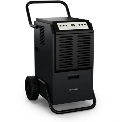 General description This dehumidifier removes up to 50 litres of water daily, making it perfect for large areas like basements, warehouses, gyms, and garages. The Klarstein DuraDry 50L dehumidifier offers exceptional performance for efficient humidity control, protecting sensitive appliances and materials from moisture while ensuring an optimum room climate. Technical specifications Dehumidification rate: up to 50 litres per day Dimensions: approx. 56 x 73 x 52 cm (WxHxD) Weight: 36 kg Tank capacity: 5.5 litres Noise level: 52 dB Compatibility and accessories Includes a drain hose Multilingual user manual Installation Place the appliance in a well-ventilated area. Usage Regularly clean the washable mesh filter. Empty the water tank as needed. Other information Robust construction with solid copper pipes and a coated steel housing for durability. Auto-defrost system protects against frost damage. Equipped with rubber wheels and handles for easy transport.