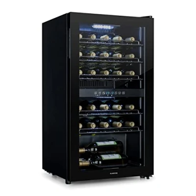 ManoManoGeneral description This Klarstein Free-Standing Wine Cooler is designed to elegantly display and preserve your wine collection. With a brushed stainless steel frame and a panoramic glass door, it showcases up to 29 bottles of wine, prosecco, and beer, making it a stylish addition to any indoor or outdoor bar area. Technical specifications Capacity: 80 liters Number of bottles: Up to 29 Cooling zones: Dual zone (5-22°C) Dimensions: 48 x 87 x 43 cm (WxHxD) Inner dimensions of upper compartment: 41 x 34 x 33 cm (WxHxD) Inner dimensions of lower compartment: 41 x 38 x 33 cm (WxHxD) Cable length: 140 cm Weight: 28 kg Annual energy consumption: 138 kWh/a Power supply: 220-240 V~ | 50 Hz Installation Free-standing design for easy placement in any location. Usage Touch-sensitive control panel for setting and maintaining temperature. LCD display for easy temperature monitoring. Ideal for storing red and white wines, prosecco, and beer. Other information Quiet operation at 41 dB for a peaceful