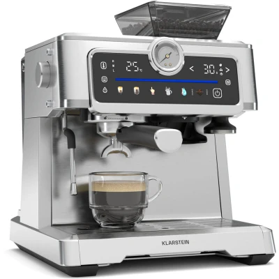 AmazonAROMATIC COFFEE ENJOYMENT: Experience delicious espressos with this espresso machine, featuring freshly-ground beans and a 20-bar pump for a brew tailored to your taste. INTUITIVE TOUCH DISPLAY: The user-friendly touchscreen on this espresso machine allows for easy operation and customisation of every coffee drink, perfect for home use. INTEGRATED PRECISION GRINDER: This espresso machine features a precision grinder for uniform bean grinding, enhancing aroma. Adjust the grind size to suit your taste. PERFECT BREWING TECHNOLOGY: The Thermoblock heating system and 20-bar pump deliver the ideal temperature and pressure for a premium espresso experience with this espresso machine. POWERFUL STEAM NOZZLE: Create perfect milk froth for cappuccinos and lattes with this espresso machine for home, featuring a powerful steam nozzle for your coffee specialities., Weight: 17.9015356744 Pounds, Manufacturer: Klarstein