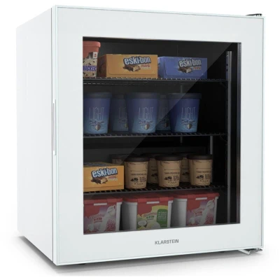 General description This mini freezer boasts an 88-litre capacity, perfect for any countertop or tabletop setup, offering ample space for your frozen essentials. The Klarstein IceAge 88 is a compact and economical freezer that fits well in small rooms, ensuring you have ice-cold food at your fingertips. With a transparent glass front and white LED interior lighting, you can easily view your stored items, making it a practical addition to your space. Technical specifications Capacity: 88 L Temperature range: 0 to -18 °C Dimensions: approx. 60 x 66 x 53 cm (WxHxD) Weight: approx. 40 kg Cable length: approx. 195 cm Compatibility and accessories Includes 3 shelves Includes 1 ice scraper Includes multilingual user manual Installation Height-adjustable feet for stability on any surface Usage Manual temperature setting using the thermostat on the back Ideal for keeping items neatly arranged and easily accessible