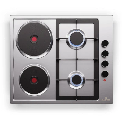 General description Enjoy the best of both worlds with the Klarstein MultiChef 4 Gas & Electric Hob, featuring 4 burners (2 gas and 2 electric) that cater to every cooking style. With an impressive power of 6300 watts, this versatile hob allows you to choose between gas and hotplate cooking, making it perfect for any culinary creation. Its stainless steel design not only ensures easy cleaning but also adds an elegant touch to any kitchen. Technical specifications Power: 6300W Dimensions: 58 x 8 x 50 cm (WxHxD) Cooking zones: 2 gas and 2 electric Safety features Automatic flame failure shut-off Child safety lock Automatic ignition Usage Experience fast and efficient cooking with the powerful gas burners, which are suitable for cast iron pans and compatible with both LPG and natural gas. The separate temperature controls for each cooking zone allow for precise cooking, ensuring optimum results whether using gas or electric. Other information Scope of delivery: 1 x hob, 1 x assembly