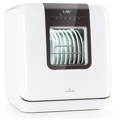 General description This Klarstein Table Top Dishwasher is the perfect solution for small homes or spaces where traditional dishwashers won't fit. With its compact design and portable features, it offers a convenient way to keep your dishes clean without the need for plumbing. The stylish glass front allows you to easily check the load status, while the automatic door opening at the end of the cycle helps reduce energy consumption during drying. Technical specifications Dimensions: approx. 42 x 47 x 42 cm (WxHxD) Weight: approx. 16.5 kg Water consumption per wash cycle: 6 litres Supply hose length: approx. 150 cm Drain hose length: approx. 150 cm Power cable length: approx. 140 cm Compatibility and accessories Includes: 1 x dishwasher, 1 x dish rack, 1 x inlet hose, 1 x drain hose, 1 x water funnel for manual filling, 1 x water jug, multilingual user manual Installation No installation required; ready to use with built-in water tank Usage 7 washing programs: ECO, Hygiene, Intensive,