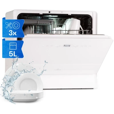 SMALL SOLUTION FOR A BIG PROBLEM: Who cleans the dishes is a problem we all face. This table top dishwasher settles the debate and does the work for you so everyone can relax. As a mini dishwasher it’s ideal for small homes or where space is limited. 6 MODES, SPARKLING DISHES: Make life easier with versatile washing programs. From the quality of cleaning, economical washing or fast cleaning, this countertop dishwasher has the perfect mode: Intensive, Universal, ECO, Glass, 90 min & Party/Rapid. PEEK INSIDE WITH A STYLISH GLASS FRONT: You will always know when this small dishwasher is full thanks to its modern glass front. Adding a touch of luxury to any home, this sleek counter top dishwasher will be your go-to kitchen accessory. FLEXIBLE DESIGN, FAST SET UP: Faster than it takes to hand wash the pots and pans, this compact dishwasher is quick to install. Just connect it directly to the tap and your kitchenware will be clean for later. It can also be built-in to the cabinet. AUTO-DOOR