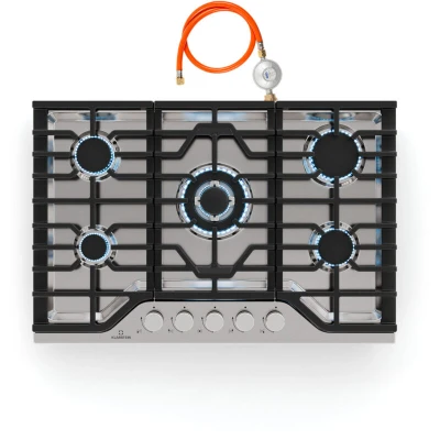 General description The Klarstein Turbocast gas hob combines professional performance and flexibility in a compact design. It features a durable stainless steel surface made of high-quality 304 stainless steel, ensuring an attractive look and hygienic properties. The robust cast iron pan holders provide exceptional stability, making it suitable for any cookware and delivering a professional cooking experience. Technical specifications Dimensions: 750 x 100 x 500 mm (WxHxL) Installation dimensions: 710 x 480 mm (WxL) Wok burner: 3.4 kW Fast burner: 2.4 kW Semi-fast burners: two at 1.8 kW each Auxiliary burner: 1.0 kW Compatibility and accessories LPG conversion kit included Integrated hose and regulator for flexible gas utilization Installation Easy installation with included LPG conversion kit Compatible with different types of gas Usage Automatic electric ignition for hassle-free operation Flame failure protection for enhanced safety User-friendly metal control knobs for convenient