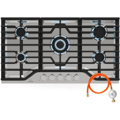 AmazonDURABLE CAST IRON SUPPORT: Robust cast iron pan holders offer exceptional stability on this gas hob, ensuring a professional cooking experience with any cookware. PREMIUM STAINLESS STEEL DESIGN: Crafted from high-quality 304 stainless steel, this gas hob is durable, hygienic, and easy to clean, making it a perfect addition to any kitchen. VERSATILE COOKING PERFORMANCE: This gas hob features a 3.4 kW wok burner, 2.4 kW fast burner, two 1.8 kW semi-fast burners, and a 1.0 kW auxiliary burner for diverse cooking needs. SAFE & EASY TO USE: This gas hob features automatic electric ignition and flame failure protection, with user-friendly metal control knobs for a hassle-free cooking experience. FLEXIBLE INSTALLATION OPTIONS: Includes an LPG conversion kit, integrated hose, and regulator, making it easy to switch gas types for your hob kitchen setup.