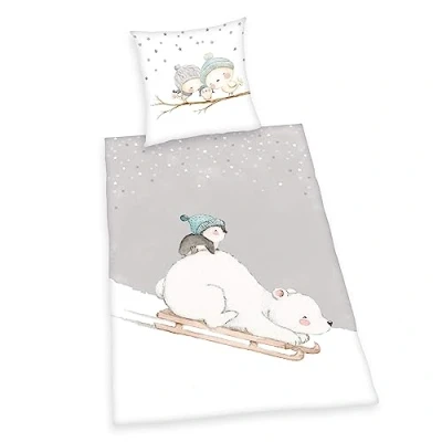 The ideal gift idea for any occasion: cuddly soft cotton bed linen with great polar bear motif Licensed 2-piece set: varied design thanks to reversible pillowcase with detailed motifs and reversible duvet cover with flat and rotating print Quick and easy to put on: pillowcase with buttons and duvet cover with practical button placket High-quality material: 100% cotton / linon, produced according to Oeko-Tex Standard 100, bright colours, easy-care: washable at 60 °C, tumble dryer-safe Box contents: 1 x Herding Young Collection Polar Bear bedding set, 1 pillowcase 80 x 80 cm and 1 duvet cover 135 x 200 cm, colour: multicoloured, item no. No.: 4651249050600