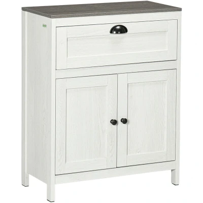 General description Expand storage with this kleankin bathroom storage cabinet. Made from sturdy particle board, it features a pull-out drawer and a bottom cabinet, providing ample storage space. The cabinet includes a three-level adjustable shelf to accommodate items of various sizes. Its classic white design, complemented by a wood-effect top, enhances any bathroom decor. For added safety, the cabinet is completed with anti-tipping straps on the back. Technical specifications Colour: Antique White, Grey Material: Particle Board Overall Dimension: 60W x 30D x 76H cm Drawer Inner Size: 48W x 26D x 15H cm Inner Each Shelf Size: 56W x 27D x 20H cm (adjustable shelf in middle gear) Foot Height: 6 cm Weight Capacity: 10 kg (overall), 2.5 kg (drawer), 2 kg (shelf) Item Label: 834-453 Usage Freestanding and compact design - ideal for smaller spaces Features a drawer and bottom cupboard for versatile storage options Adjustable shelves allow for customization based on storage needs Other