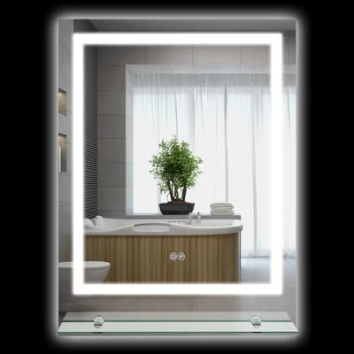 Adjustable lighting: Cycle through warm white, white and cool white on this bathroom wall mirror. Adjust brightness using touch control. Includes memory function. Fog-resistant: View yourself clearly post-shower with the antifog feature on this LED bathroom mirror. Convenient shelf: Store essential items within reach on the shelf included with this bathroom LED mirror. High-quality glass: This makeup mirror features copper-free, silver-coated glass for superior reflection. Protective film prevents cracks. Specific dimensions: Measures 80L x 60W x 2.7Dcm. Requires professional installation and hard-wiring. IP44 safety rated.